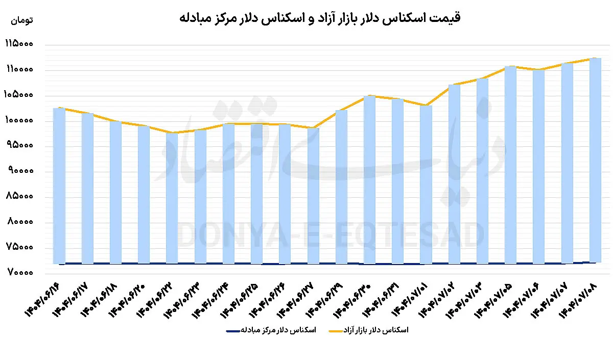 روز سهشنبه دلار در بازار آزاد قیمت ۱۱۲ هزار و ۴۰۰ تومان را ثبت کرد که نسبت به روز پیش از آن ۱۰۰۰ تومان رشد کرد. پس از اعمال تحریمهایی از سوی شورای اروپا و ژاپن، تروئیکای اروپایی در بیانیه مشترکی از ایران برای مذاکره و تعامل دعوت کردهاند. با این حال انتظارات در بازار همچنان افزایشی است که سقف جدید دلار حاکی از این امر است. روز گذشته دلار با قیمت ۱۲ هزار و ۴۰۰ هزار تومانی بازگشایی شد و در ادامه روز با نوسان قیمت تا ۱۲ هزار و ۸۰۰ تومان پیش رفت و در انتها به قیمت بازگشایی بازگشت. رشد قیمت دلار روز گذشته در حالی اتفاق افتاد که کشورهای اروپایی و ژاپن از بازگرداندن تحریمها علیه ایران خبر دادند. همزمان قیمت جدید دلار در تالار دوم نیز رقم خورد. پس از فعالشدن نمادهای اسکناس دلار و یورو در سامانه بازار ارز تجاری مرکز مبادله، اسکناس دلار در بازه ۸۰ تا ۹۴ هزار تومان نوسان داشتهاست. بازرگانان گروه دوم که مقدار تقاضایشان کمتر از مقدار خاصی است و کالای وارداتی آنها مشخص است در این بازار سفارش ثبت میکنند.