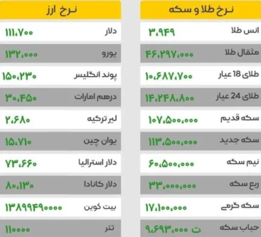 قیمت طلا،سکه و ارز امروز سه‌شنبه ۱۵ مهرماه