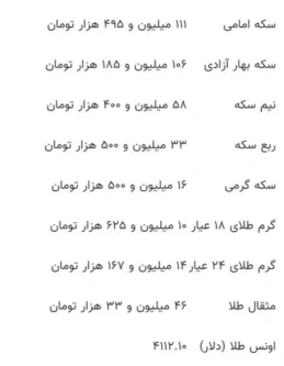 به گزارش اکو بانک:گزارشها حاکی از آن است که هر قطعه سکه امامی با کاهش ۲ میلیون و ۱۹۵ هزار تومانی، ۱۱۱ میلیون و ۴۹۵ هزار تومان شد.
