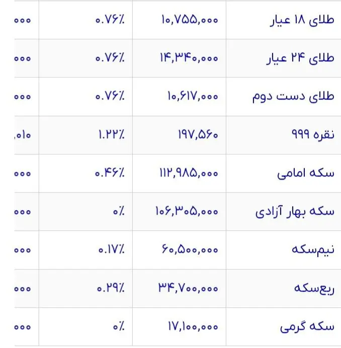 در بازار سکه، سکه امامی با قیمت ۱۱۲,۹۸۵,۰۰۰ تومان معامله شد که ۰.۴۶٪ نسبت به روز قبل رشد داشت. سکه بهار آزادی بدون تغییر نسبت به روز گذشته ۱۰۶,۳۰۵,۰۰۰ تومان ثبت شد. نیمسکه با قیمت ۶۰,۵۰۰,۰۰۰ تومان و ربعسکه ۳۴,۷۰۰,۰۰۰ تومان معامله شد. همچنین سکه گرمی در بازار با قیمت ۱۷,۱۰۰,۰۰۰ تومان فروخته شد.