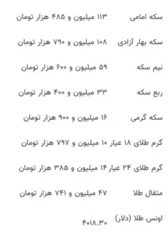 به گزارش اکو بانک:هر قطعه سکه امامی با کاهش ۴۹۵ هزار تومانی، ۱۱۳ میلیون و ۴۸۵ هزار تومان شد.