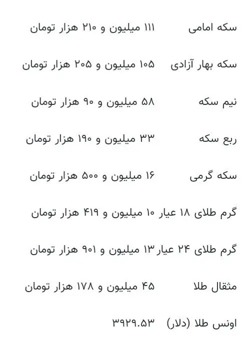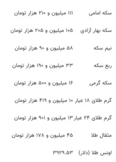 در ادامهٔ روند کاهشی قیمت جهانی طلا که از هفتهٔ گذشته آغاز شده، قیمت هر اونس طلا به ۳۹۲۹ دلار رسید.