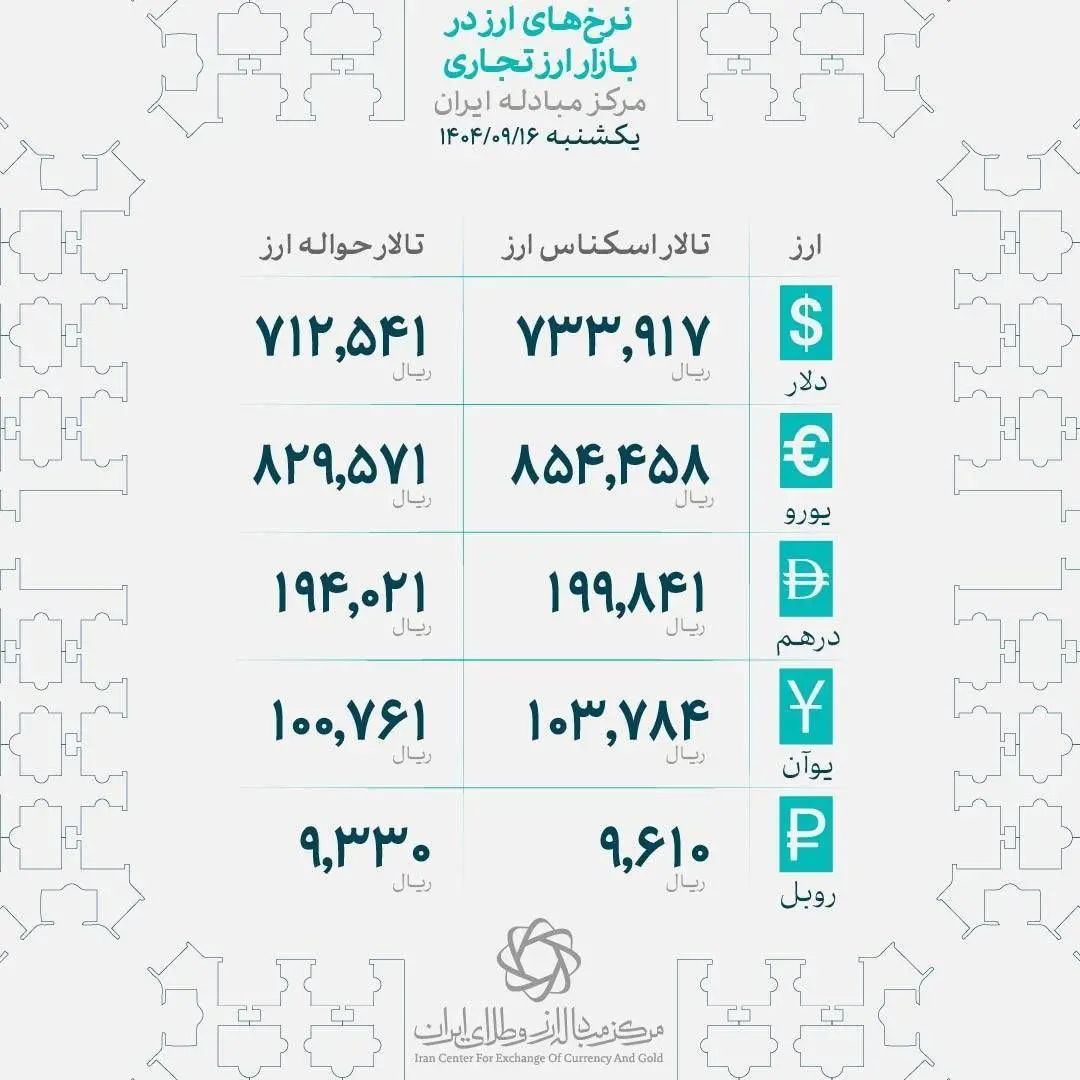 به گزارش اکو بانک، قیمت اسکناس و حواله دلار توافقی در بازار ارز تجاری امروز یکشنبه ۱۶ آذر ۱۴۰۴ توسط بانک مرکزی اعلام شد و به ترتیب با اصلاح قابل توجه ۴۶۰۳ و ۴۴۶۹ ریالی نسبت به روز کاری قبل به ترتیب به نرخ ۷۳۳,۹۱۷ و ۷۱۲,۵۴۱ رسید.