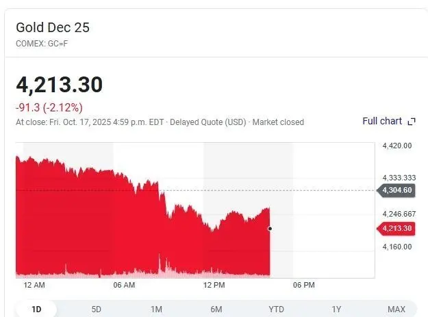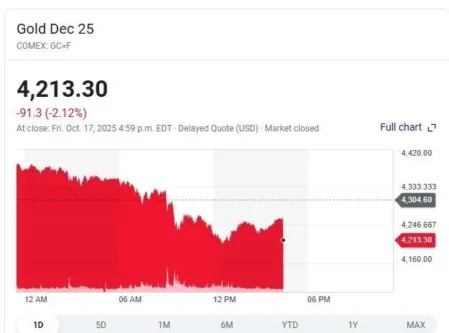 قیمت هر اونس طلا با ریزش ۳ درصدی از محدوده بالای ۴۳۰۰ دلار به حدود ۴۲۰۰ دلار سقوط کرد و به پایینترین سطح خود در هفتههای اخیر رسید.