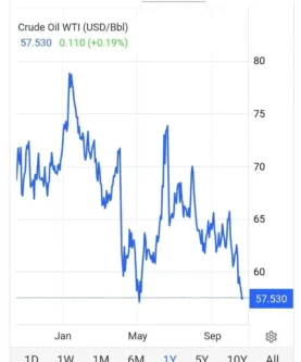 از سوی دیگر، در بازار انرژی نیز نفت برنت با افت مداوم قیمت به کف یکساله خود در محدوده ۵۷ دلار رسید؛ افتی که تحلیلگران آن را ناشی از نگرانی نسبت به کاهش تقاضای جهانی و افزایش ذخایر نفتی میدانند.